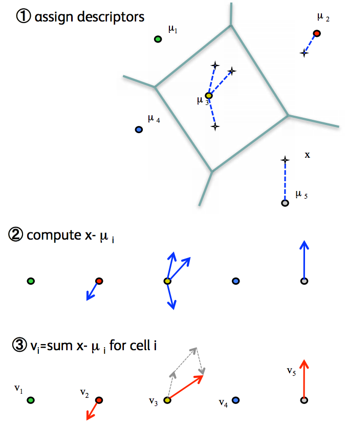 2 VLADBefore we proceed, did you get the joke? If not, go ahead and read this article on Vlad the Impaler. He was a ruthless Romanian ruler who impaled prisoners of war in a gory way. But what we are about to discuss has nothing to do with him. In our case, VLAD stands for Vector of Linearly Aggregated Descriptors. This is another model that we use for image classification. All the steps here are very similar to what we did in BoW, including generating the codebook. But once we have the codebook, the method in which we encode the stats is different. Instead of just storing the class to which a particular feature belongs to, we compute the distance to the nearest centroid and store it. This is called first order statistic. As you can in the figure here, the point near µ2 is closer to the centroid than the point near µ5. In the BoW model, this is not accounted for. Hence we end up losing this information. In the VLAD model, this information is stored for each class and is used as a measure.