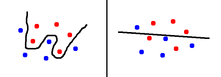 Consider the figure on the left. The curvy line separates the two sets of points really well. The accuracy is high and we are all happy. But the set of datapoints we have is a small set. This means that we don’t really know what the real world data actually looks like. We just hope that these points are good enough to be representative of the real world data and build a model based on that. So if we fine-tune it too much by making it very curvy, we might actually perform really badly on unknown data.