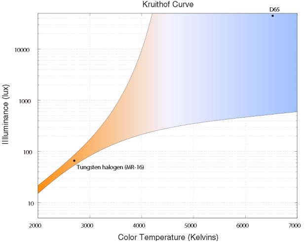 This is more of a continuation of my blog post on color temperature. Back when fluorescent light sources first came up, they changed the way humans thought about light and color rendering. A scientist named Arie Andries Kruithof performed some experiments on how the human eye relates the amount of light in a given time of day to the color temperature of the light source, and came up with a theory. As we move through the day, the amount of light we get keeps varying. Typically, human beings like higher color temperature light sources during the daytime hours, and lower color temperature sources once the sun goes down. People in warmer climates tend to favor cooler color temperature sources, and people in colder climates like warmer light. So what does this have to do with the Kruithof curve? Continue reading “Kruithof Curve”