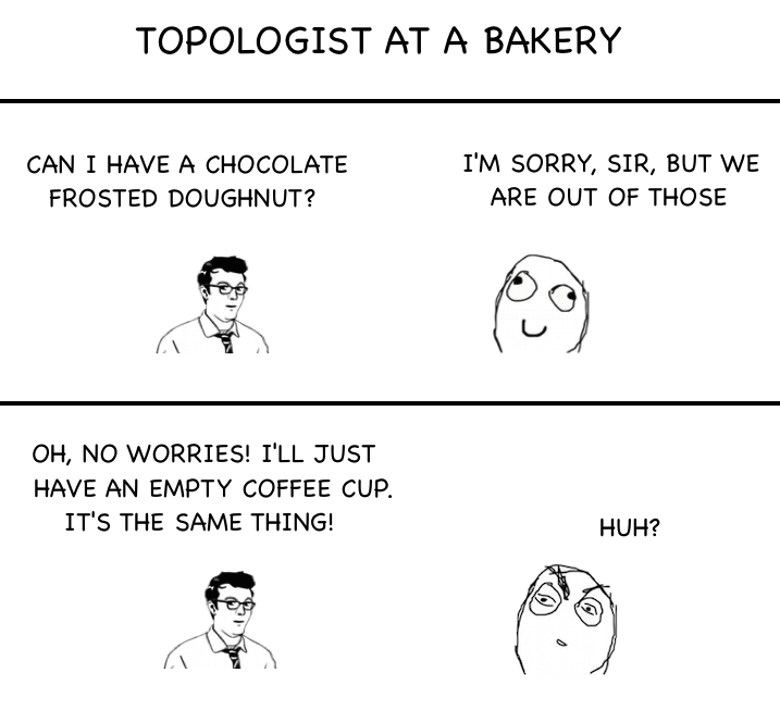 Did you get the joke in the picture to the left? If not, you will do so in a few minutes. I was recently reading an article and I came across the terms mentioned in the title. From the looks of it, they are very close to each other, right? In many fields within mathematics, we talk about objects and the maps between them. Now you may ask why we would want to do that? Well, transformation is one of the most fundamental things in any field. For example, how do we transform a line into a circle, or fuel into mechanical energy, or words into numbers? There are infinitely many types of transformations that can exist. Obviously, we cannot account for every single type of transformation that can possibly exist. So we limit ourselves to only the interesting ones. So what exactly is it all about? How does it even relate to the title of this blog post? Continue reading “Homomorphism vs Homeomorphism”